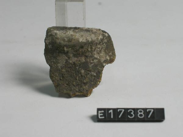 Frammento di recipiente ovoide con labbro appena esoverso e presa a lingua sull'orlo.