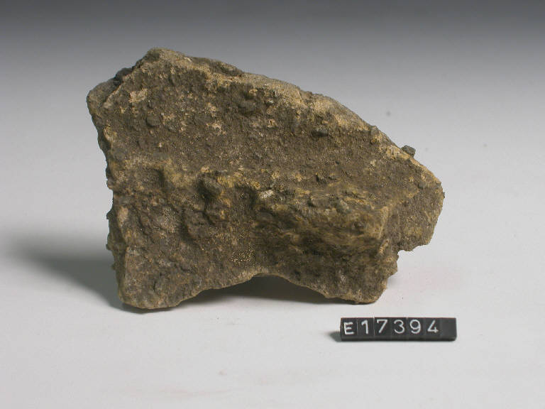 Frammento di parete e orlo di recipiente provvisto di un cordone decorato a tacche impresse e di una presa a lingua.