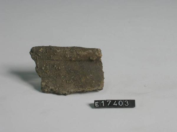 Frammento di orlo e parete di recipiente; orlo ingrossato a sezione triangolare.