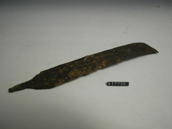 Frammento di lama di spada in ferro con breve tratto di codolo; lama piuttosto lunga e piatta.