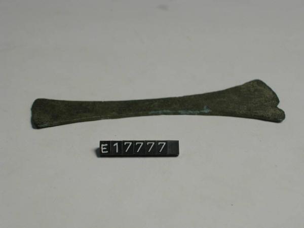 Ascia a sezione piatta e sottile con brevi margini rialzati ed estremità alllargate.