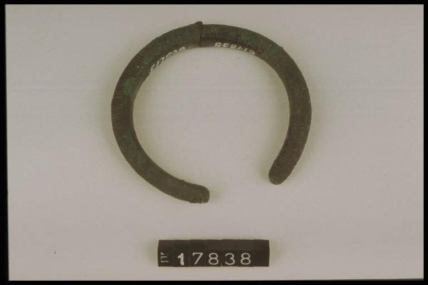 Armilla a sezione subcircolare decorata da fitte incisioni trasversali.