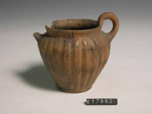 Vasetto a corpo ovoide biansato con decorazione a costolature verticali sul corpo.
