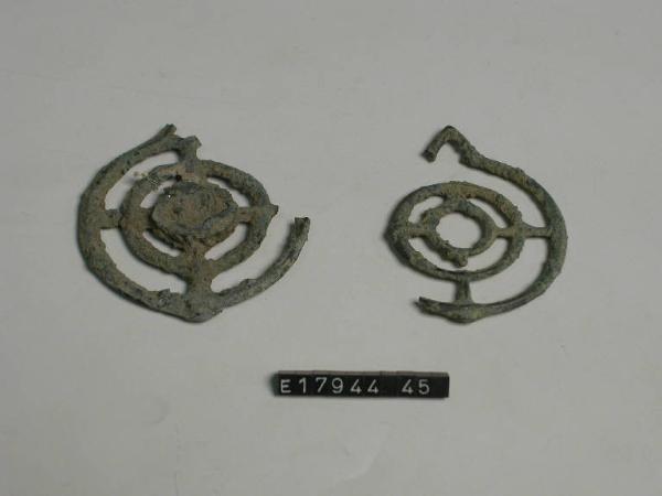 Pendaglio a ruota costituita da tre anelli concentrici legati da sbarrette ortogonali; L'anello più esterno presenta un elemento triangolare.