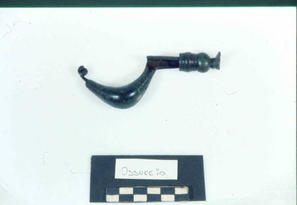 Fibula a sanguisuga con staffa desinente a globetto seguita da un'appendice troncoconica sagomata.