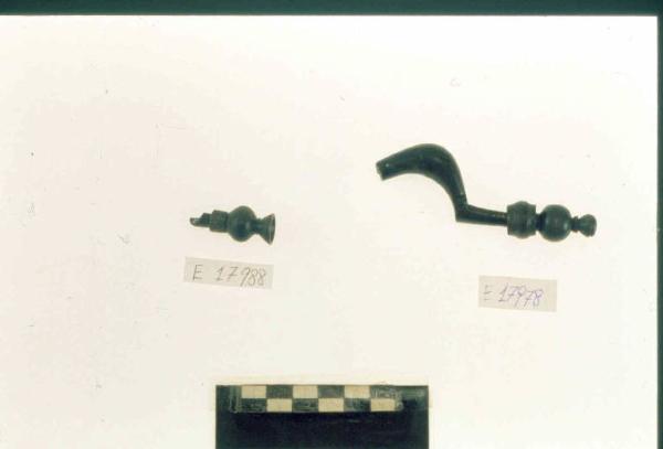 Fibula a sanguisuga con staffa desinente a globetto seguita da un'appendice conica piena.