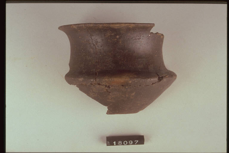 Bicchiere con labbro svasato, collo conico, carena pronunciata, ventre fortemente rastremato, fondo piano ombelicato.