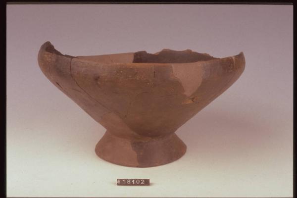Ciotolo con labbro rientrante, orlo arrotondato, profonda vasca troncoconica, basso piede troncoconico; impasto di colore bruno scuro in sezione ed in superficie.