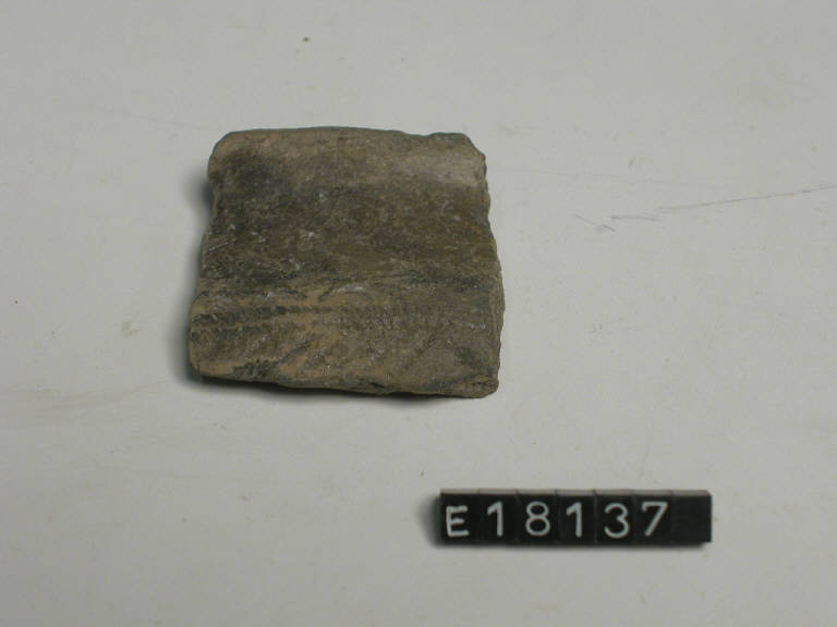 Frammento di orlo e parete con spalla arrotondata e decorata ad incisione da archetti e denti di lupo a falsa cordicella.