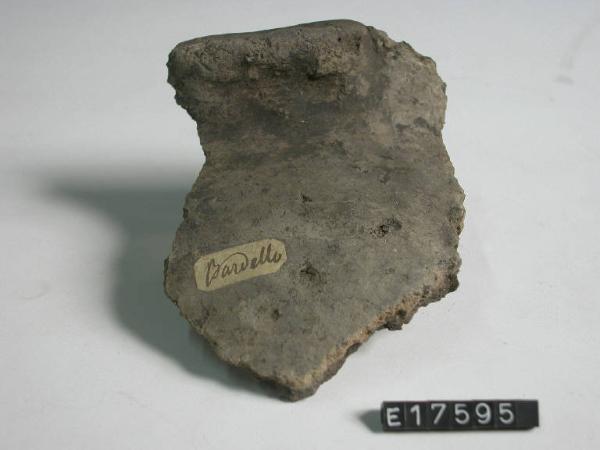 Recipiente ovoide con labbro esoverso, piccole prese a linguetta sull'orlo.