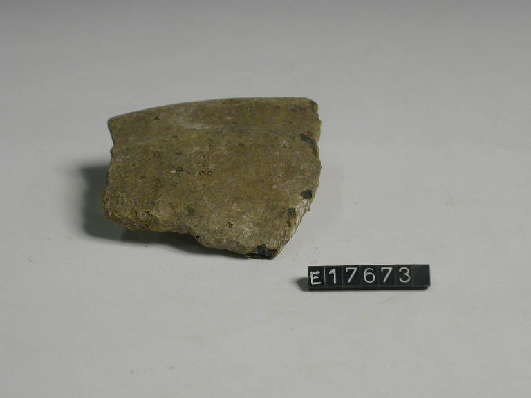 Frammento di recipiente a corpo ovoide con breve spalla arrotondata e labbro verticale.