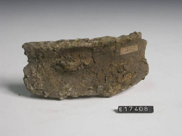 Recipiente di grandi dimensioni con labbro svasato, orlo piatto e presa a lingua sulla gola.