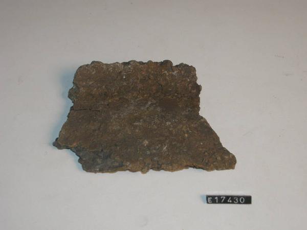 Recipiente di grandi dimensioni con pareti a profilo convesso, labbro svasato, orlo decorato a profonde impressioni.