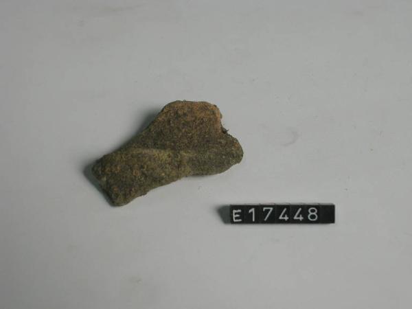 Frammento di recipiente con accenno di cordone, provvisto di piccola presa a lingua.