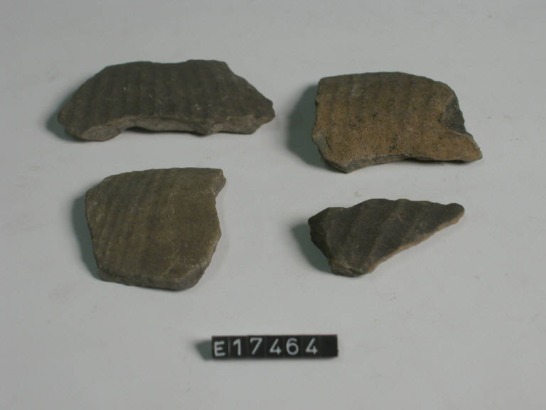 Frammenti di pareti pertinenti a recipienti diversi, decorati a solcature parallele.