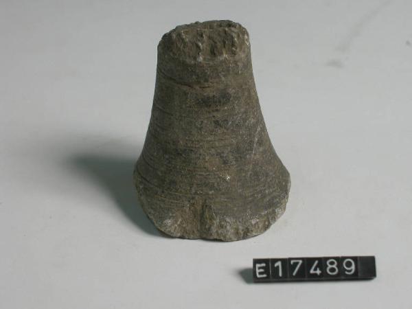 Elemento lapideo a profilo troncoconico decorato da fasci di linee parallele incise.