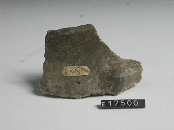 Recipiente con alto labbro a profilo concavo, orlo a profilo esoverso, provvisto di una decorazione plastica a lingua sulla spalla.