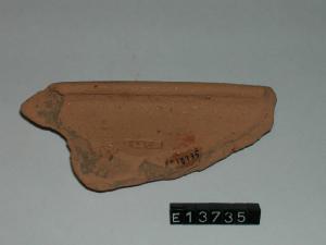 Frammento di orlo e parete di patera con labbro verticale e orlo leggermente rientrante. La superficie esterna è dipinta; quella interna è decorata a stampigliatura da cerchielli disposti orizzontalmente.