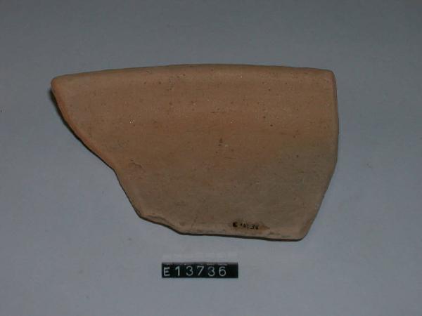 Frammento di ciotola a corpo poco profondo con alto labbro verticale. Si notano tracce di colore scuro.