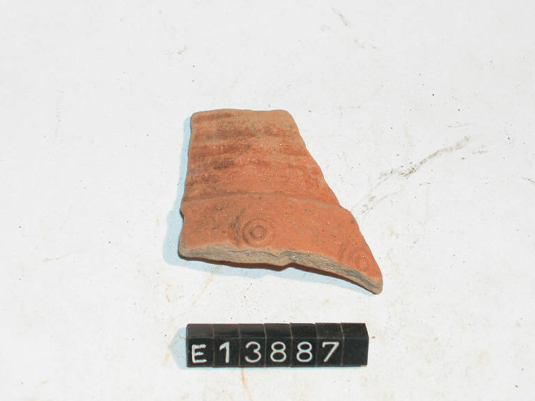 Frammento di parete di bicchiere a risega mediana con costolature e due stampiglie a cerchi concentrici.