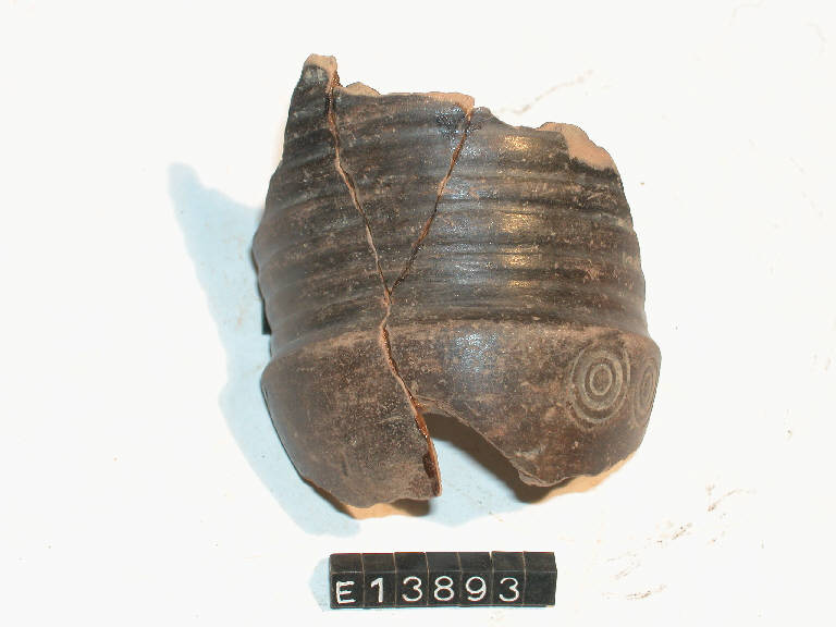 Frammento di parete di bicchiere a risega mediana con fondo piano. Due stampiglie a occhi di dado lungo il diametro massimo.