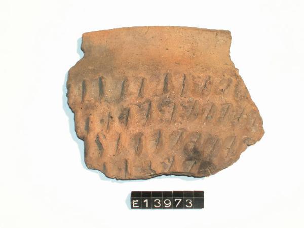Frammento di olla ovoide con collo appena accennato e orlo arrotondato; decorazione impressa ad alveare.