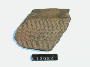 Frammento di orlo e parete di olla con orlo arrotondato, breve gola; decorato sotto la gola ad alveare.