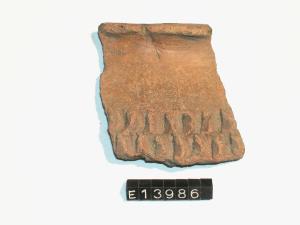 Frammento di orlo e parete di olletta con orlo estroflesso arrotondato e breve gola; decorata dalla gola in giù da file orizzontali di unghiate verticali.