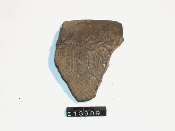 Frammento di orlo e parete di olla ad orlo arrotondato, decorata sulla spalla da una profonda linea ondulata e a rete obliqua sul corpo.