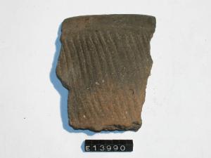 Frammento di orlo e parete di olla decorata a linee parallele incise verticalmente.