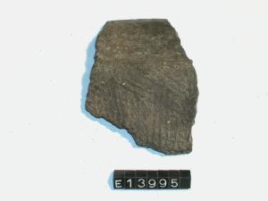 Frammento di olla con orlo arrotondato, decorata con un incisione ondulata e impressioni a pettine in serie verticali e oblique