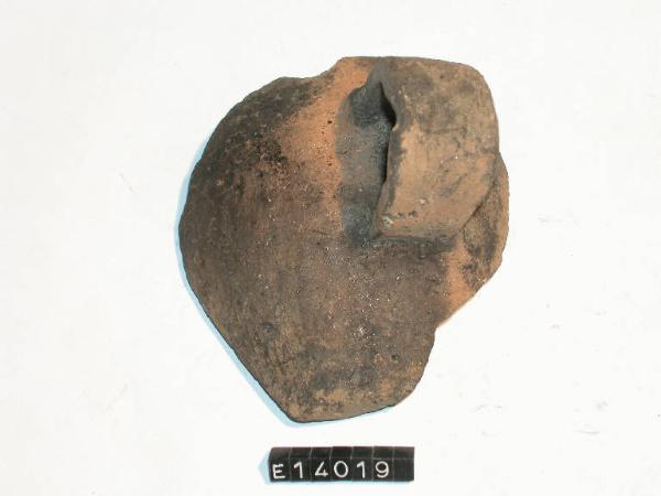 Frammento di parete di boccale con orlo arrotondato e ansa a nastro verticale; fondo piatto.