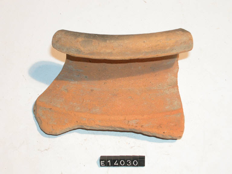 Frammento di orlo e parete di olla con labbro estroflesso, solcatuire interne dovute alla lavorazione al tornio, collo cilindrico, spalla arrotondata con costolature.