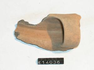 Frammento di ansa e parete di recipiente a spalla alta; ansa a nastro impostata sul collo e sulla spalla.