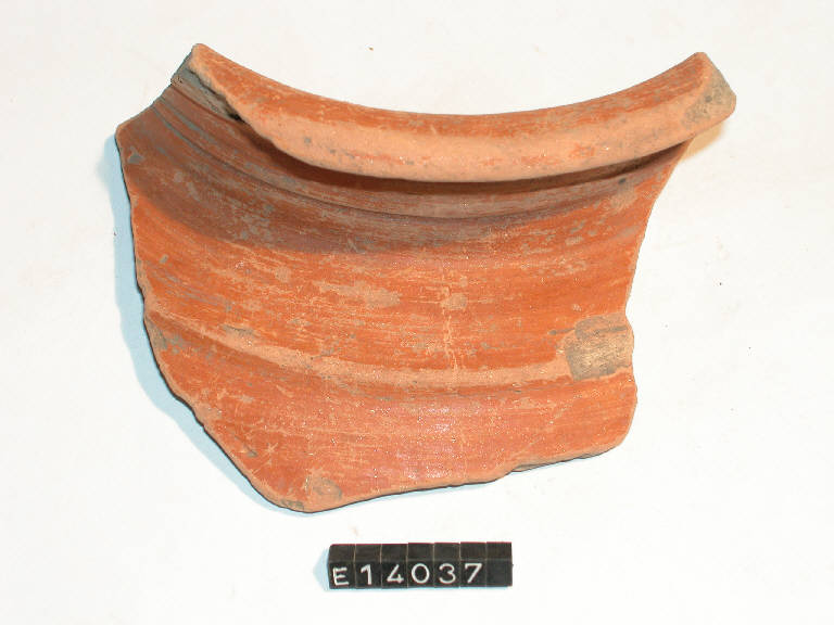 Frammento di olla cordonata con collo cilindrico e tre solcature; labbro ingrossato.