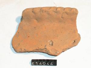 Frammento di orlo e parete di scodella a corpo troncoconico. Labbro esoverso, orlo decorato a tacche oblique.