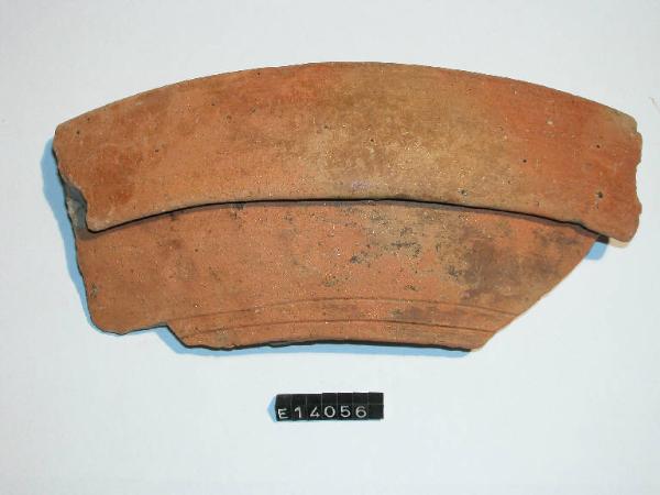 Frammento di mortaio con labbro ingrossato a fascia. Interno dipinto di rosso.