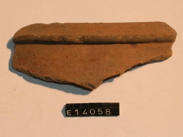 Frammento di orlo e parete di recipiente, orlo obliquo che sporge esternamente 7 mm dal labbro.