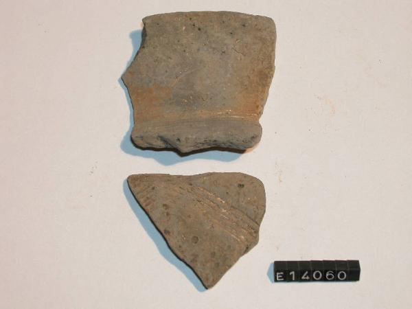 Frammento di orlo e parete di recipiente in ceramica grossolana. Lungo collo svasato; orlo arrotondato; decorazione a brevi tratti incisi sulla spalla. Alterato dal calore.