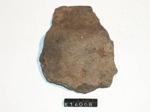 Frammento di orlo e parete di recipiente a corpo troncoconico con orlo arrotondato, labbro verticale e spalla marcata.