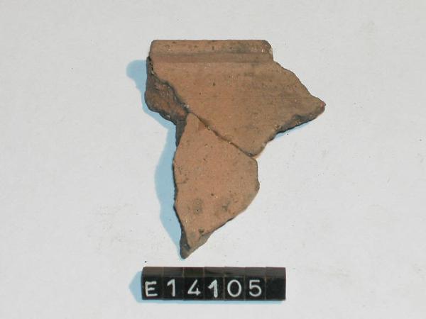 Frammento di orlo e parete di recipiente con orlo estroflesso piatto, due incisioni a brevi tratti obliqui sotto la gola e piccole impressioni leggermente oblique sulla spalla.