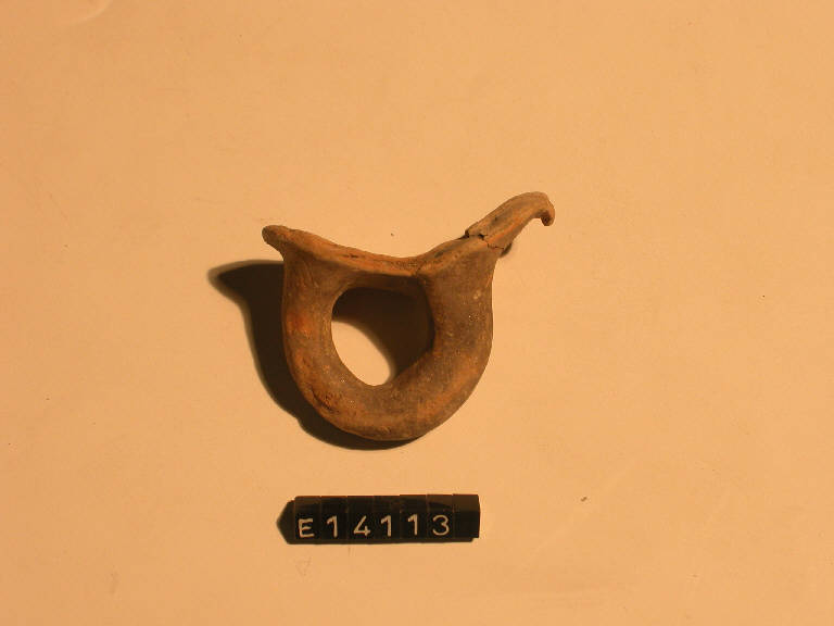 Frammento di boccale a corpo ovoide con ansa a occhiello. Superficie bruno lucido.