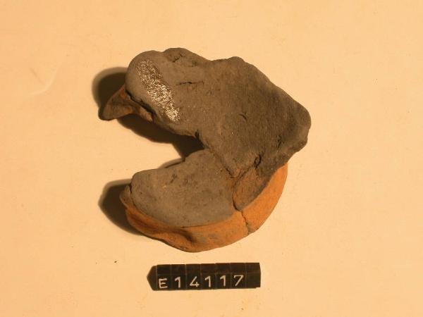 Frammento di fondo e parete di olletta con piede leggermente svasato. Cottura imperfetta.