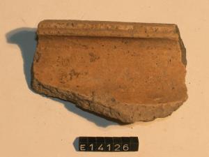 Frammento di orlo e parete di dolio con labbro esoverso, orlo piatto con costolatura esterna e collo cilindrico.