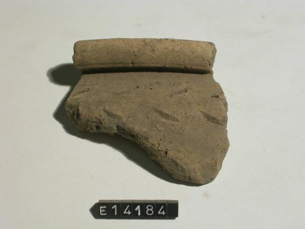 Frammento di orlo e parete di olla con orlo esoverso ingrossato a cordone e decorazione a tacche incise sulla spalla.