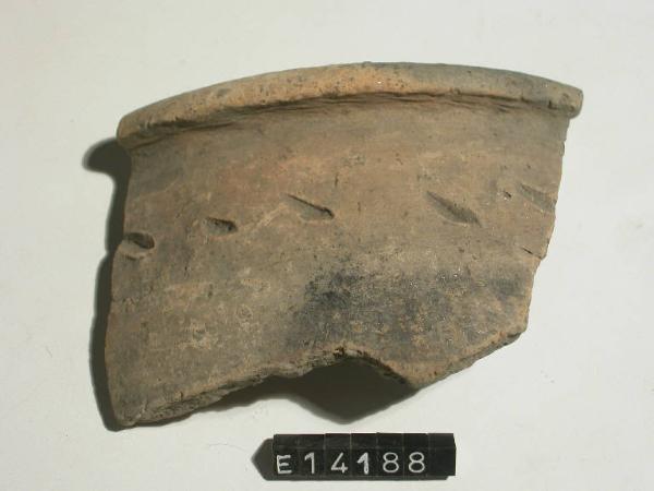 Frammento di orlo e parete di olla con orlo esoverso e decorazione a tacche incise lungo la spalla.