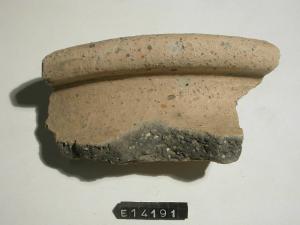 Frammento di orlo di dolio costolato, con orlo estroflesso arrotondato.