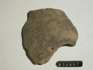 Frammento di orlo e parete di olletta con labbro diritto e decorazione a tacche fra labbro e spalla; spalla leggermente arrotondata.