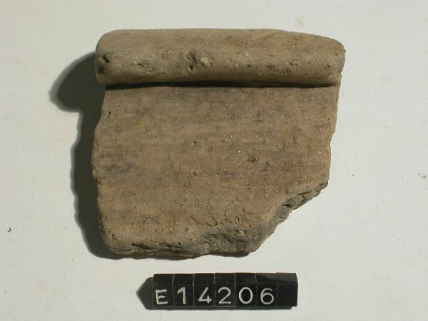 Frammento di orlo e parete di olla con orlo ribattuto e decorazione a tacche oblique incise.