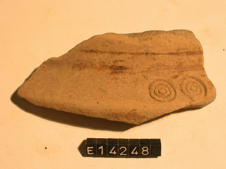 Frammento di parete di recipiente con spalla carenata, decorato da due stampiglie a cerchi concentrici.